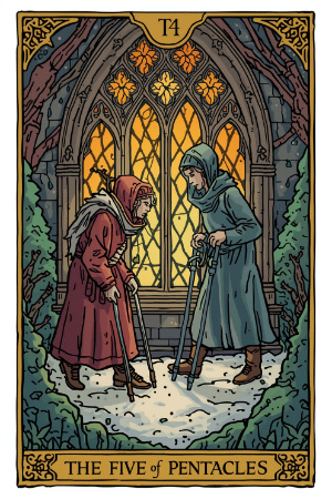 The Five of Pentacles shows two figures out in the cold — ragged, struggling, one on crutches — walking past a warm, stained-glass window. Help is available. Light exists. But they’re looking down, not up. In a relationship reading, this card carries a particular kind of sadness, because it’s not about drama or betrayal. It’s about quiet suffering — the slow drain of a relationship that leaves you poorer than it found you.