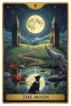 The Moon card is dreamlike and disorienting — a full moon between two towers, a path winding into the distance, a crayfish crawling out of a pool, a dog and a wolf howling at the sky. Everything is lit by reflected light, which means nothing is quite what it looks like. Shadows everywhere. That atmosphere is the toxic dynamic this card describes.