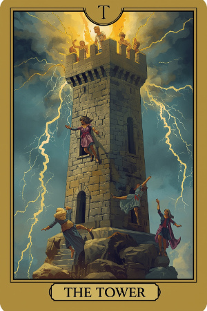 The Tower is probably the most dramatic card in the deck, and it earns that reputation. It shows a stone tower being struck by lightning, people falling from the windows, a crown blown clean off the top. Everything built on a false foundation is coming down — fast, loud, and without warning. In a relationship reading, few cards carry this kind of voltage.