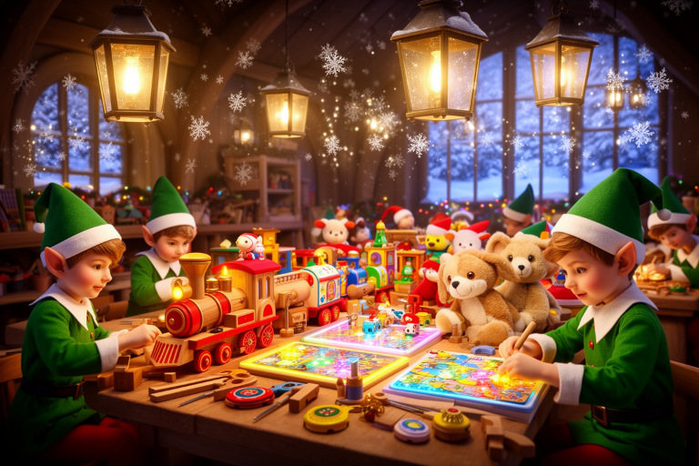 Throughout the year, the workshops buzz like honeycomb hives. Some elves carve wooden toys, others stitch plush animals, and a few experiment with magical gadgets that glow, jiggle, or float. But they don’t rush; every toy is made with intention. And there’s something sweet about watching them test each little creation—bouncing balls, squeezing teddy bears, ringing tiny bells—just to make sure they’ll bring joy to the kids who’ll open them.