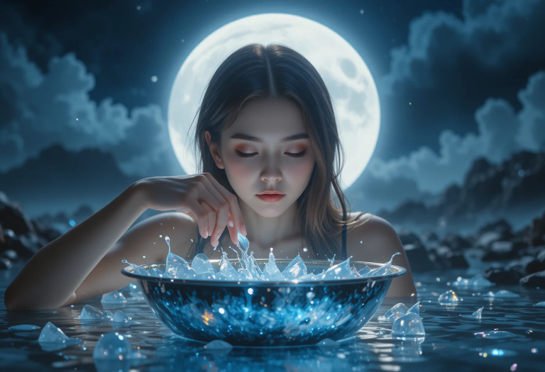 Place the silver object in the moon water. Light the candle. Dip your fingers into the bowl and trace your collarbone or wrists. Say: